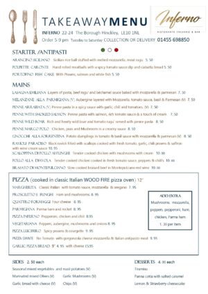 Inferno is an independent family owned Italian restaurant in the heart of Hinckley's busy town centre. It is just 2 minutes walk of the Concordia Theatre and the Atkins building.